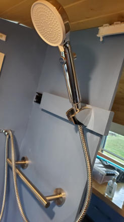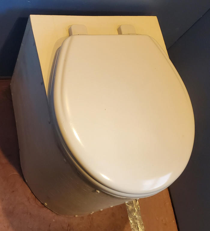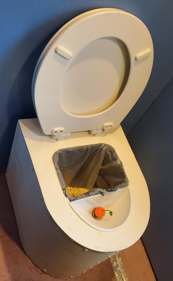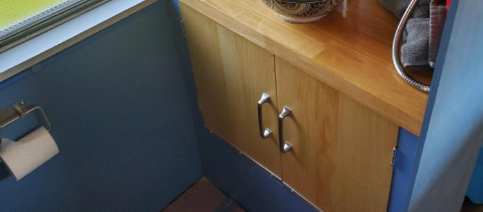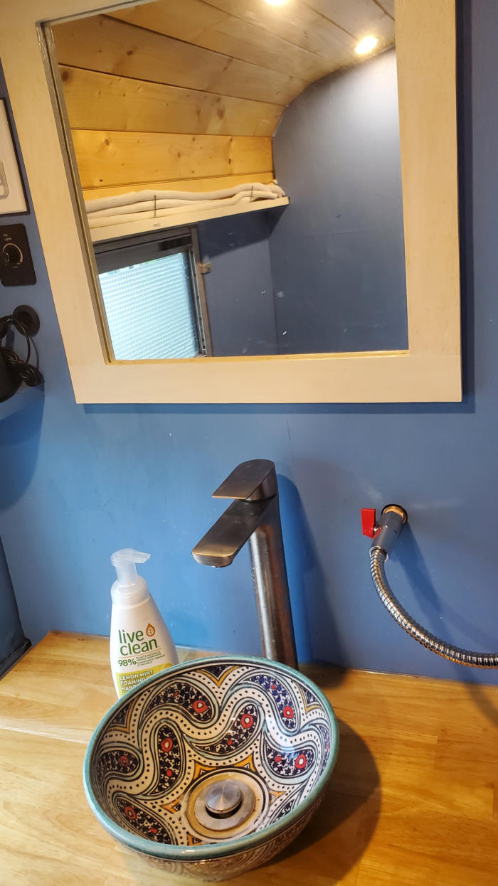 There is a bathroom with a counter and on it a Moroccan handmade pottery vessel sink. There are cupboards under the sink and wall-mounted mirror. The toilet is a purpose-built composting toilet with a urine diverter. Liquid waste goes in its own container. Solid waste goes in a compostable bag. (One-and-done. No warehousing poop.) Watch me build it here.The bathroom is plumbed with a working shower head, but no shower tray on the floor. (I found it easier to use public showers in camp grounds.)