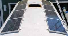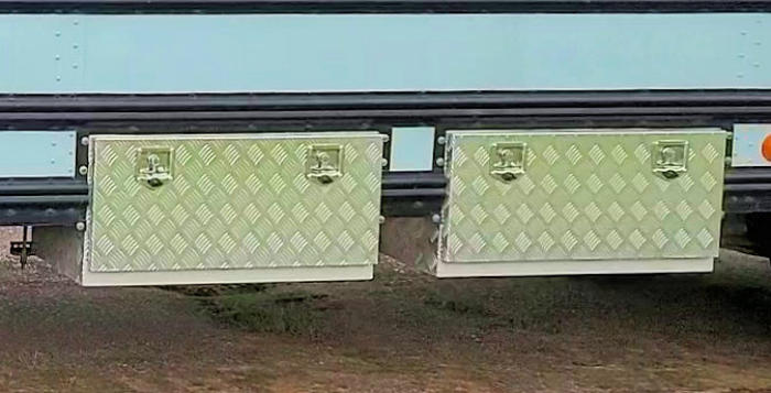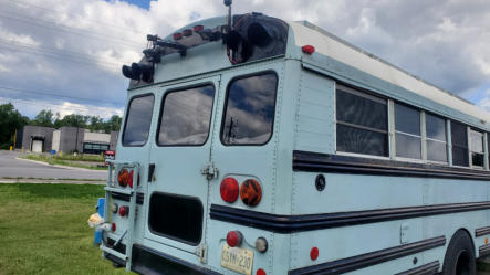 The roof is a highly reflective, elastomeric white paint that creates a waterproof membrane. The hood has been professionally painted in a body shop. The rest of the bus was hand painted with a quality oil paint. Touch ups are easy.There are 800 watts of solar panels on the roof. (Watch them being installed here.) And there are two top-of-the-line Maxxair fans. (Watch them being installed here.)There are twin backup cameras high up on the rear. One is aimed straight back and is a great aid to everyday driving. The other points down towards the bumper for parking in tight places. (Watch them being installed here.)There are four under-mounted aluminum storage boxes. (Watch them being installed here.) One houses the propane tanks for the range and water heater. (The propane installation was done by an RV professional.)Another box houses the fuel for the diesel heater. (For safety, no fuels are stored in the passenger area.) The two remaining boxes are for storage.I have installed a trailer hitch receiver on the front bumper. (Watch it being installed here.) It will accept a bike rack that lets you take your eBikes on the road. (Bike rack not included.)