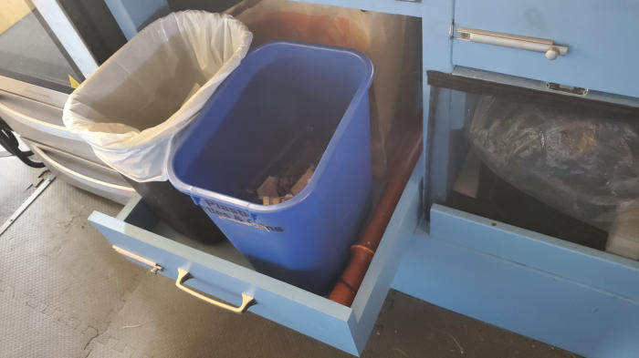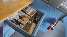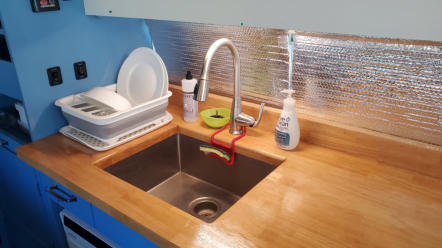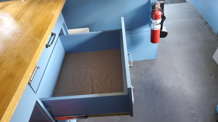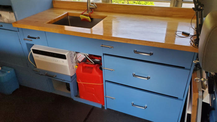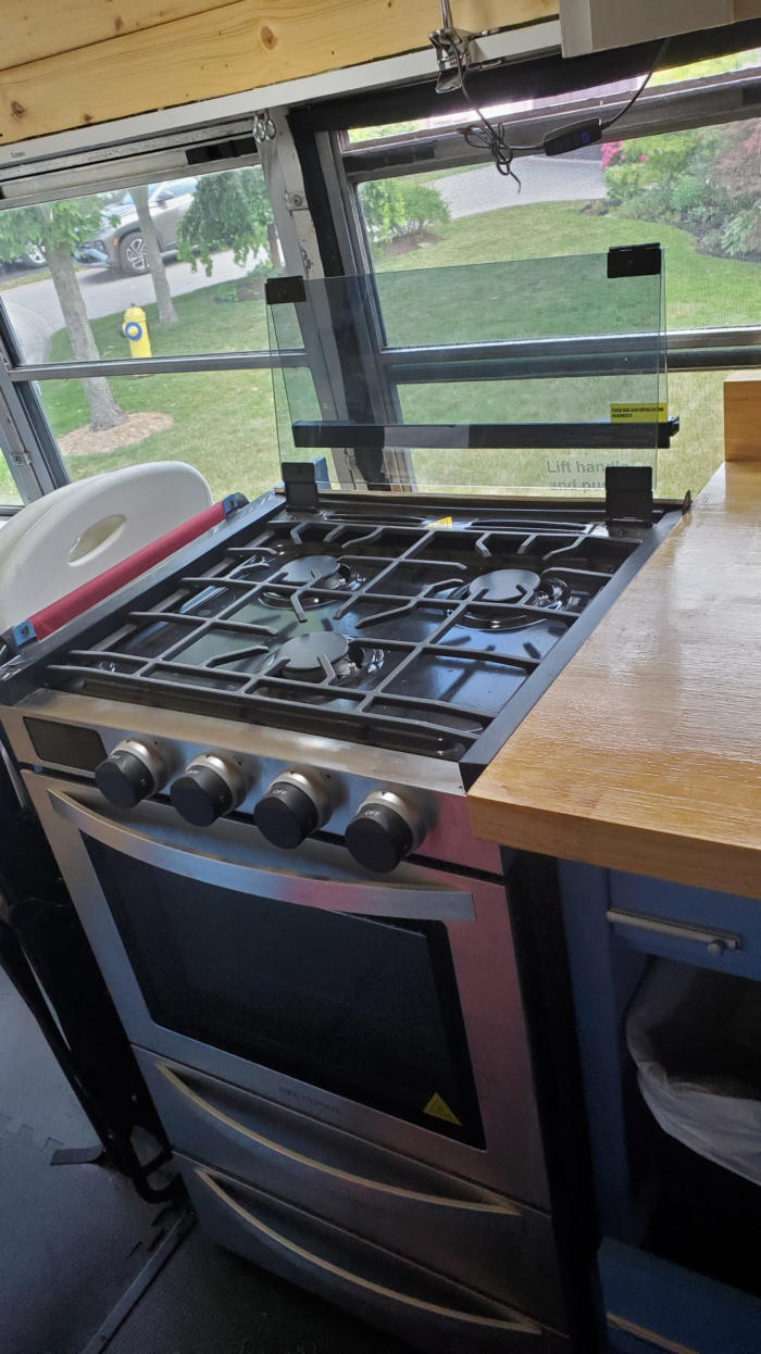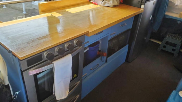 The kitchen features:•more than six feet of solid Acacia hardwood butcher-block counter top;•a large under-mounted sink;•a microwave oven;•a three-burner propane range with oven;•an apartment-size fridge and freezer;•eight solid pine drawers with full extension glides•dimmable under-cabinet lights over each counter top;•shelves over the counters and the fridge for yet more storage space.