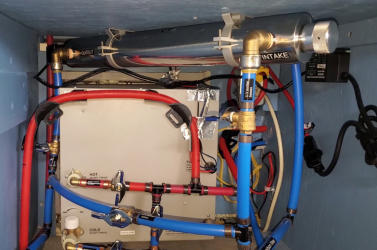 By design, 100% of the plumbing (fresh water and gray water) is in the